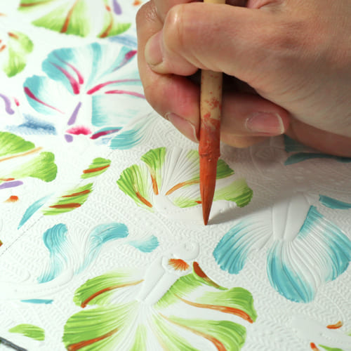 こちらも決まった”枠”は無く、彩色職人の滑らかな筆さばきによって