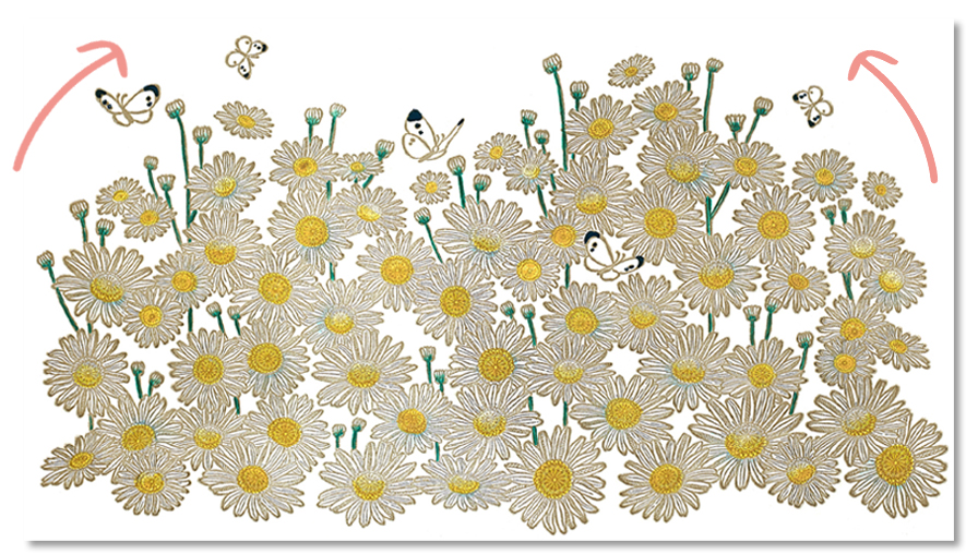 全体を引きで見ると、手前のお花は大きく、奥のお花は小さく描かれているのが分かりますでしょうか?