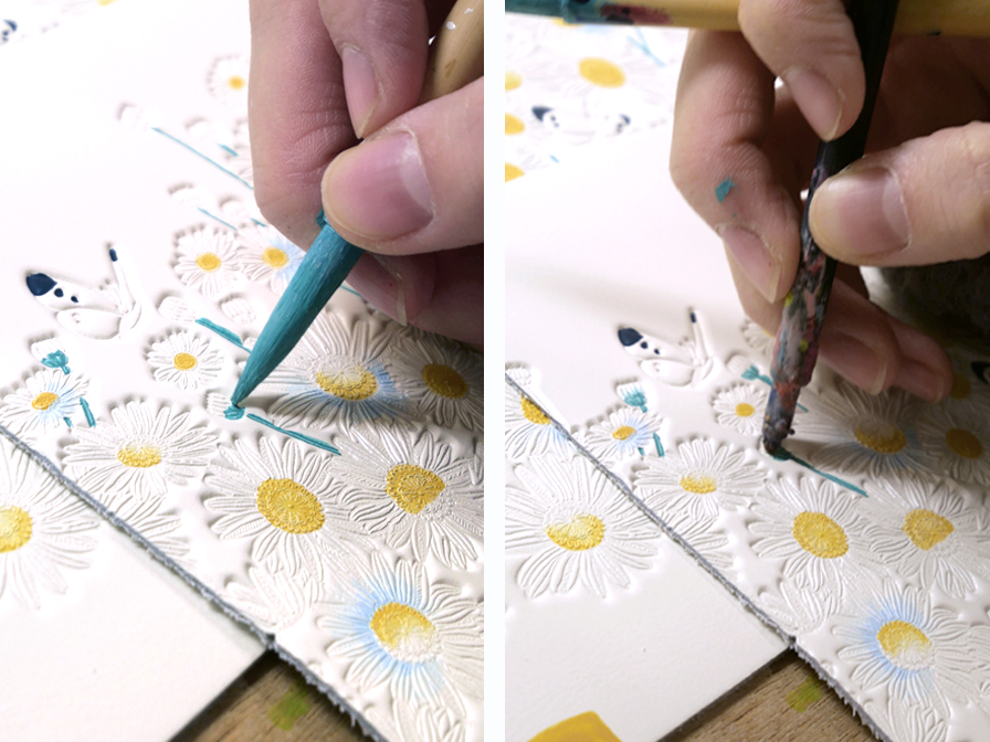 絵の具をちょんちょん置いて…⇒ 専用の筆で優しくぼかしを入れていきます。