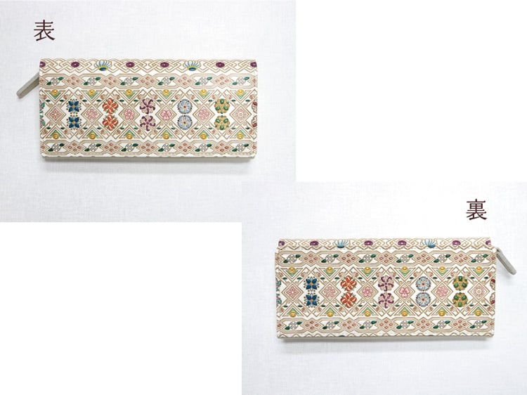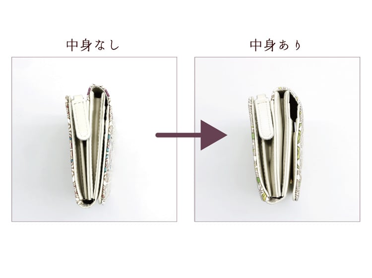 小銭入れ側は無地のアイボリーを使用しており、スッキリとした印象なのですが、「両面文庫革のL字ファスナーのスリム束入れ」は、小銭入れ側にも文庫革を使用し、表も裏も柄が入る作りとなっております。