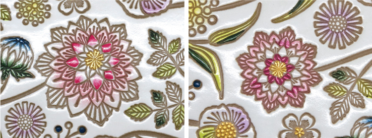 この柄のメインモチーフ・ダリアは 大・小 の2種類が描かれており、塗り方がそれぞれ違うんです。