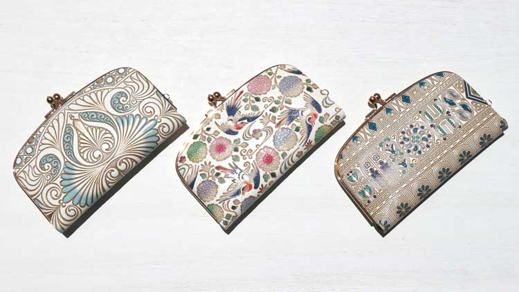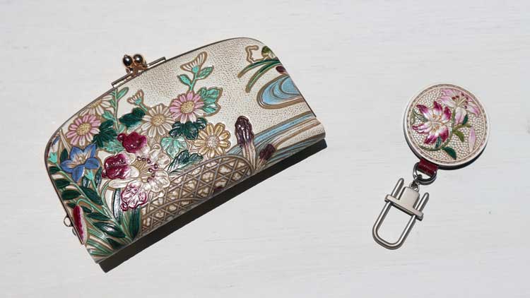 天溝がま口は百合の周りに竹籠や流水が描かれています