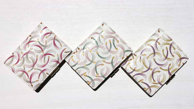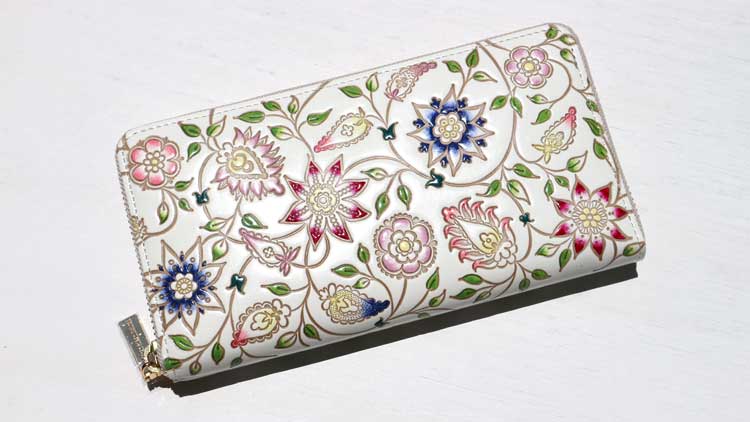 清涼感のある白革に、くるくるとダンスするように描かれた松葉たち