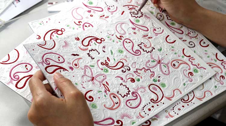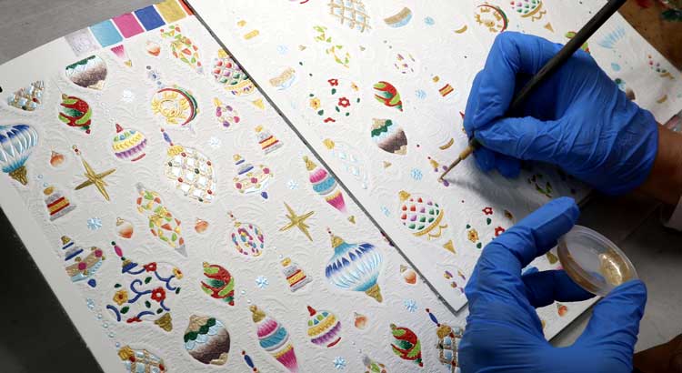 製作に数か月かかる文庫革、職人たちは夏の間からクリスマス柄をせっせと製作しておりました