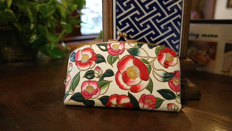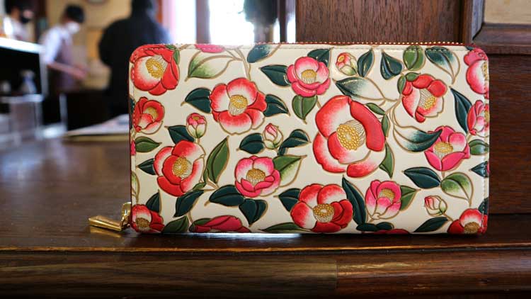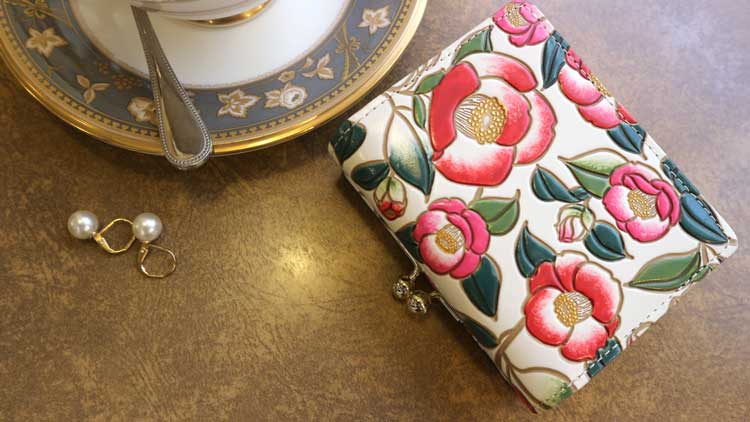 白い革にぽってりつやつやとした赤い椿が映えてかわいい