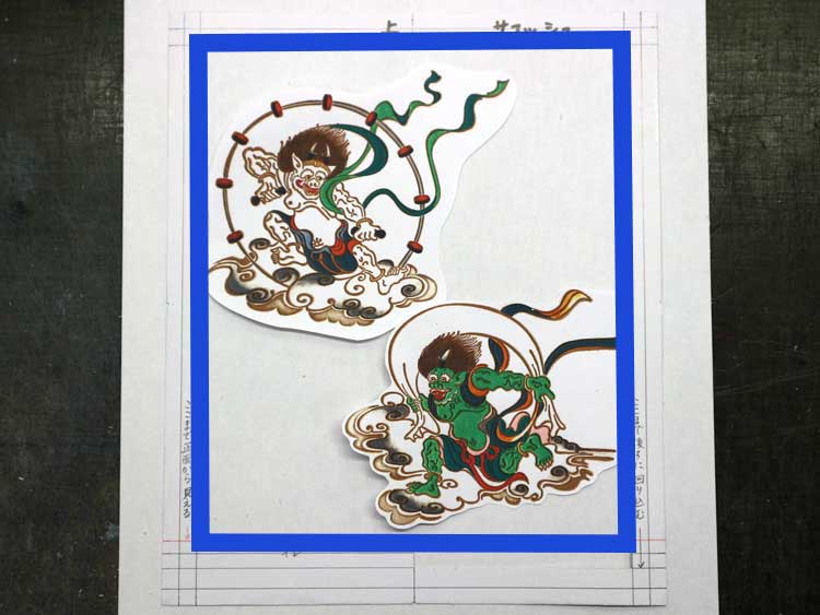 【風神雷神】はどんな位置で型押しされるのか型押し職人に確認したところ、おおよそこんな位置取りになるそうです👇(青枠内が柄の出るところです)かっこいい…!※周りの白い部分はシボが入ります