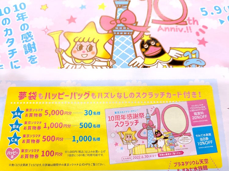 東京ソラマチでお使いいただけるお買い物券が当たるスクラッチカードもついてます