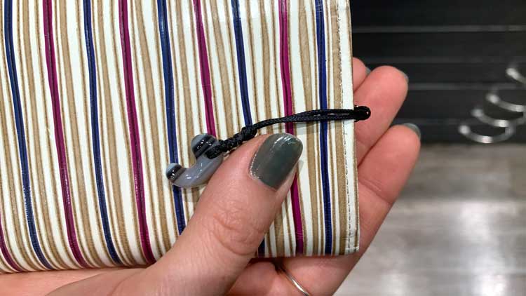 根付やチャームのつけられる紐カンがあるのもうれしい!彼女は矢鱈縞とおそろいのストライプ模様の天然石の根付をつけていました✨