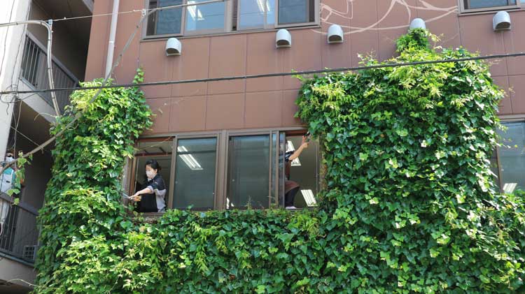 初夏から秋の工房の風物詩(?) 工房の壁面のつたのお掃除の様子🌿 チョキチョキ✂️ 職人総出で取り組んでおります(写真は建物の2階の部分🏢) 今年も元気にもりもり繁っちゃったね…