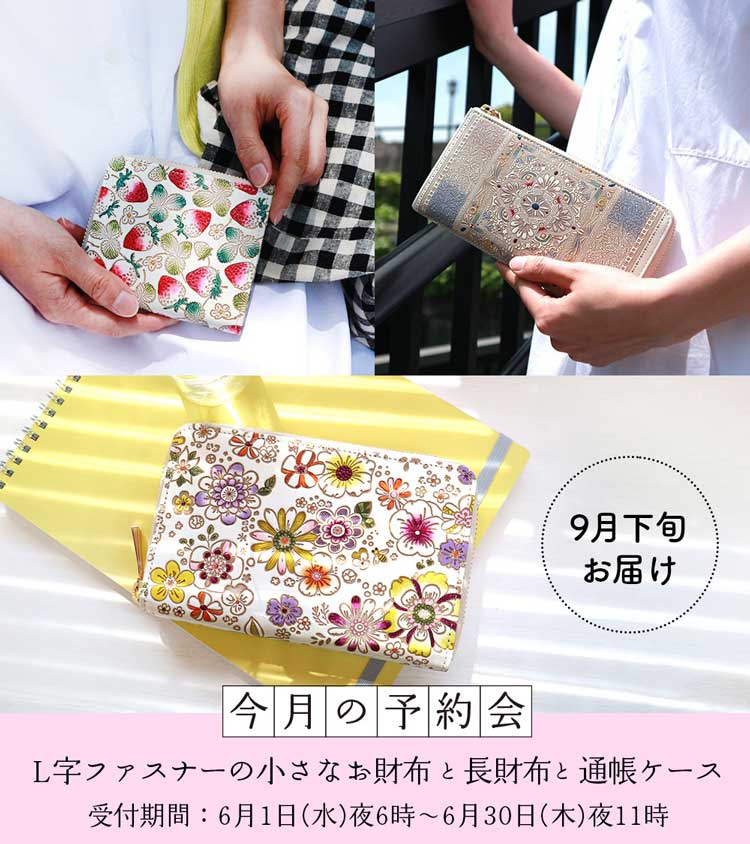 そして今月の予約会のアイテムは【L字ファスナーの長財布】【L字ファスナーの小さなお財布】【通帳ケース】の3アイテム