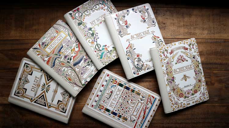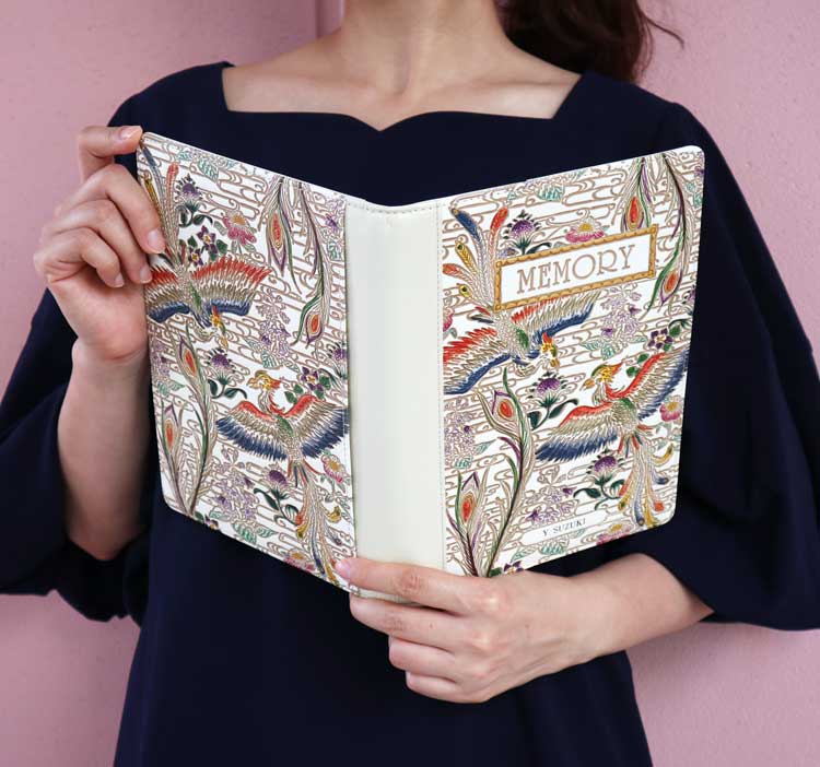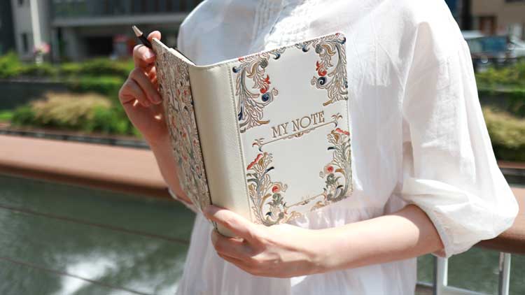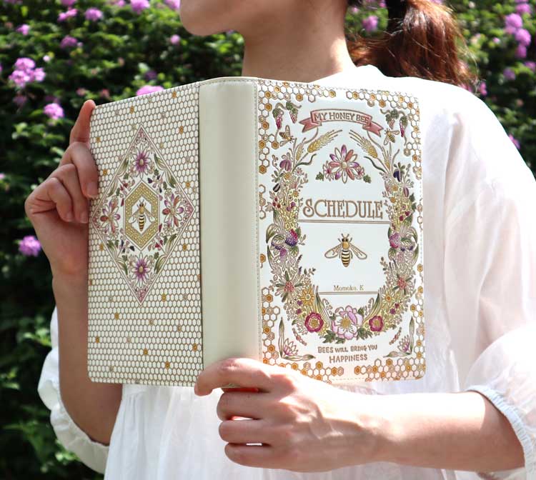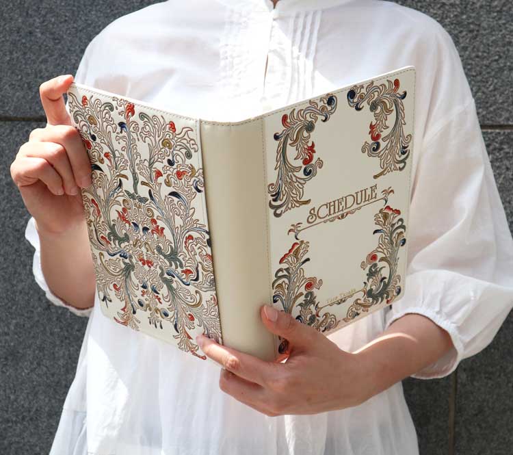 美しい白革が映えるすっきりとしたデザインと、ネイビー、ブルーグレー、オレンジ、ゴールドと落ち着いた大人の配色、みずみずしい彩色やぼかしの技巧が加わって、神聖な雰囲気のノートカバーに仕上がりました