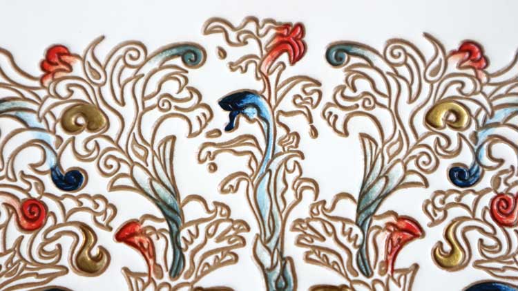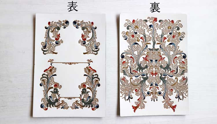 左右対称のデザインを基調にしながら、ところどころ非対称なモチーフが混ざっているのが楽しい 繊細さと大胆さが楽しめる柄です