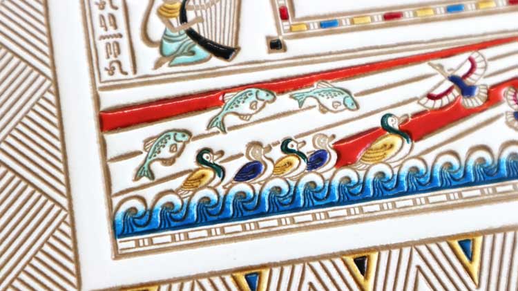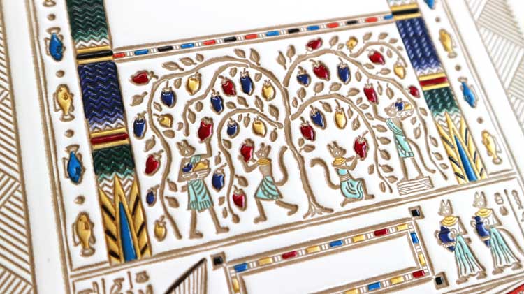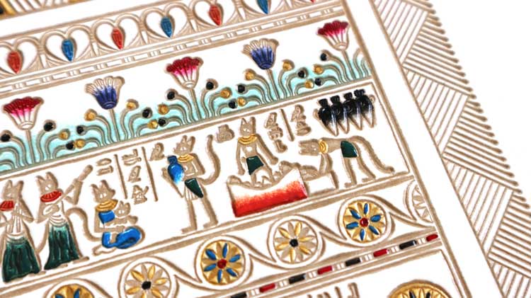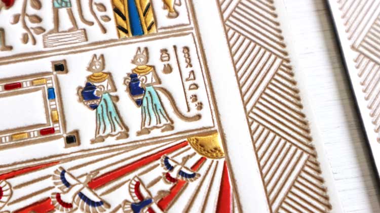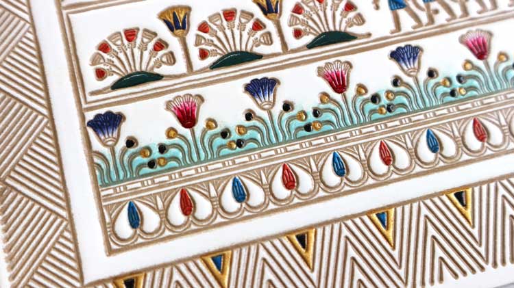 赤、青、オレンジなど元気な色+キラキラゴールド、ところどころにポイントでブラックも入ってエジプトのゴージャス感、太陽や砂漠の暑いイメージを表しています☀️