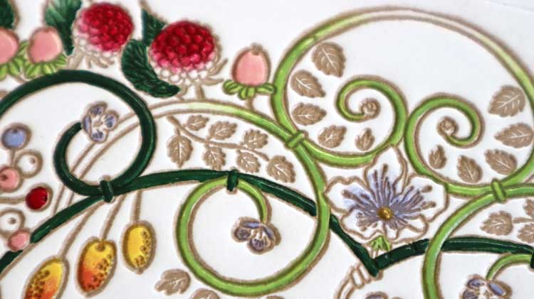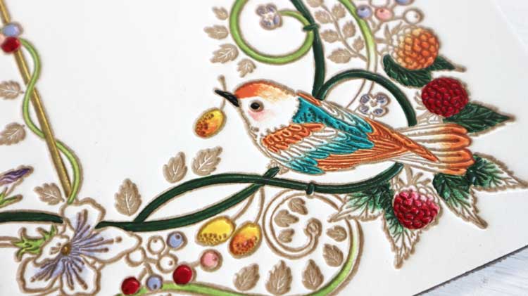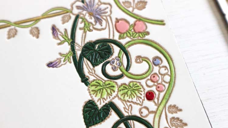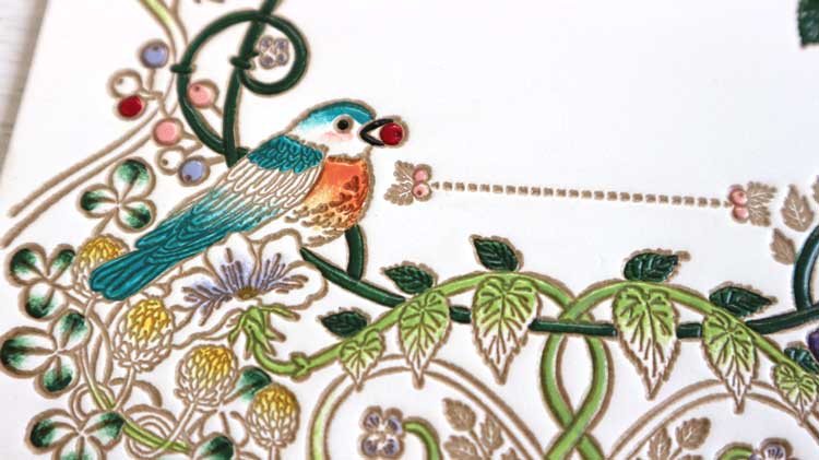 お財布の方はとにかく緻密で繊細な線が見どころでしたが、オーダーノートカバーはカローのモチーフを生かしつつ、しっかりとした輪郭線が特徴です、ちょっと雰囲気が異なりますね