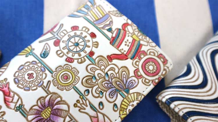 「箱マチ小銭入れ/ガーデン」 じょうろや水車のようなモチーフが夏に合います