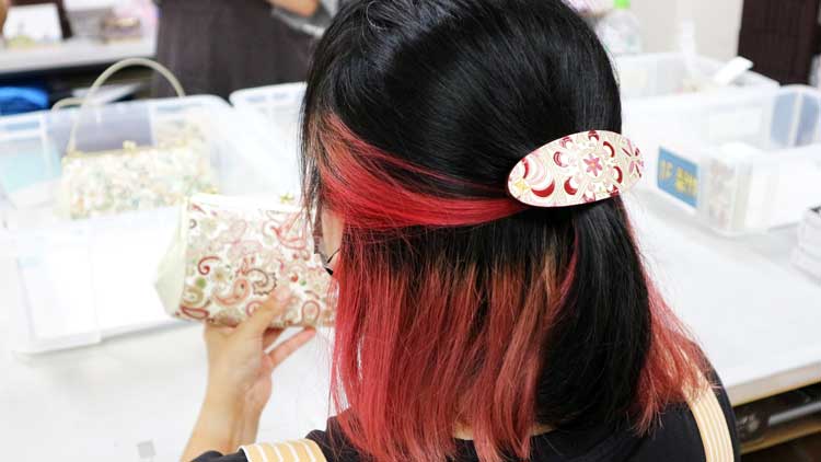 検品室に入ると、レッドカラーのお姉さんが商品の検品中でしたよ、赤い御髪に錦紗(ピンク)のバレッタ、これも有りねえ…!おしゃれ🥰