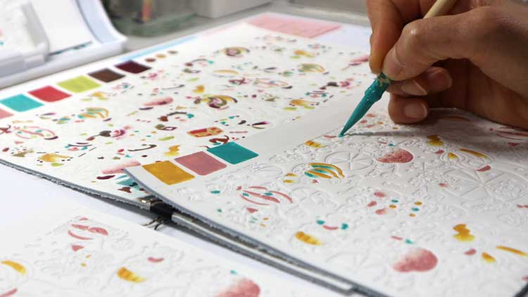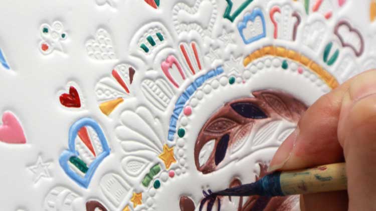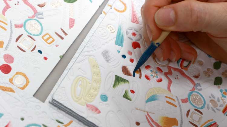 新柄の情報がないか社内をウロウロしていると、彩色職人たちが新柄、塗っておりましたよ…!