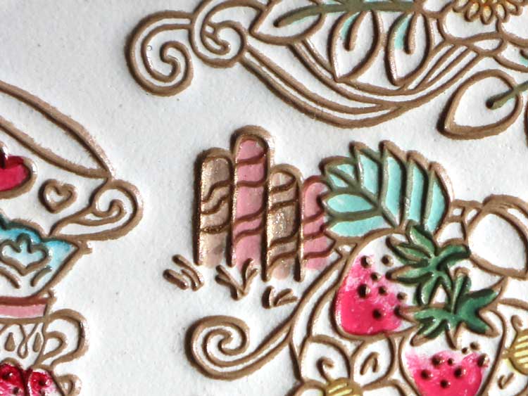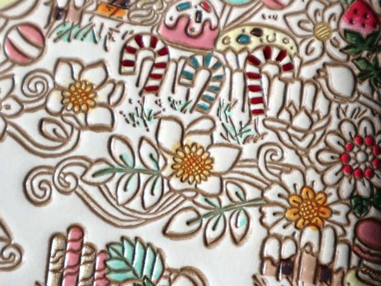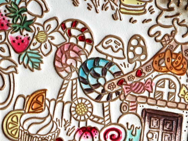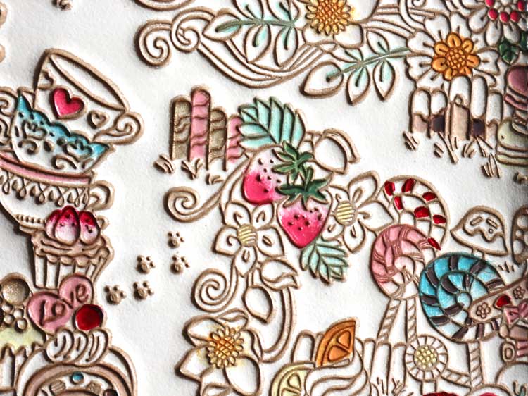 ▼アンバランス感を加えて不思議な世界を楽しんでもらえるよう、いちごが大きく描かれていたり